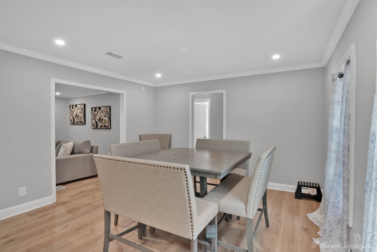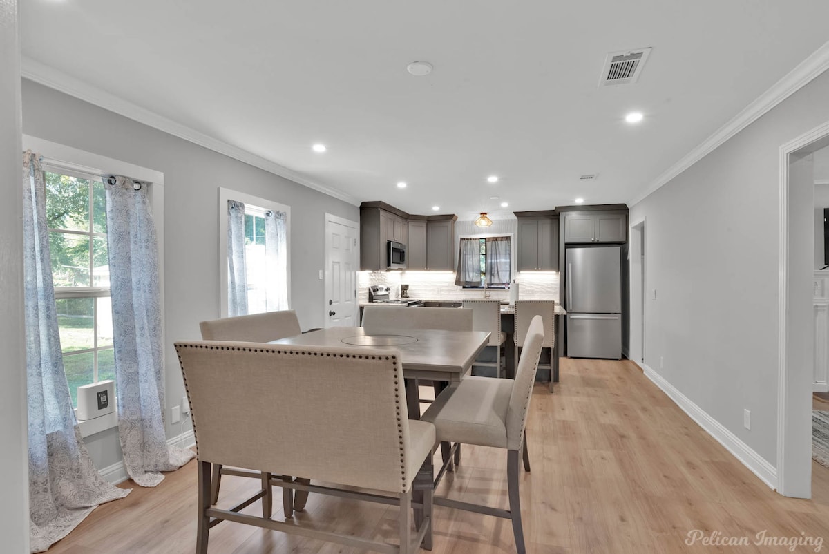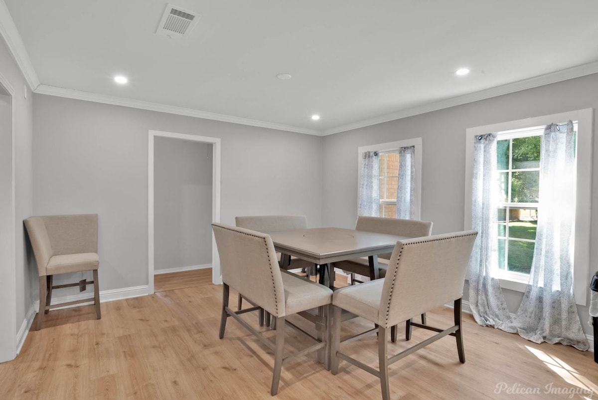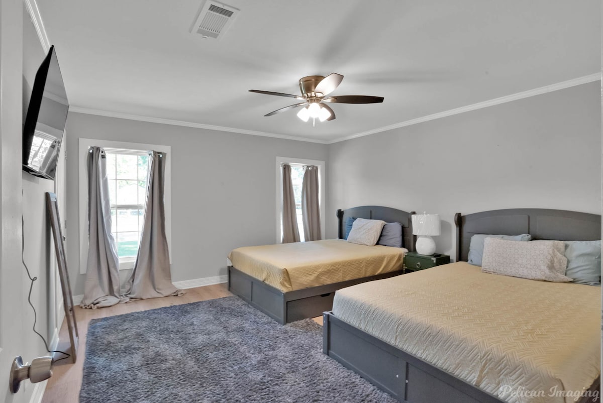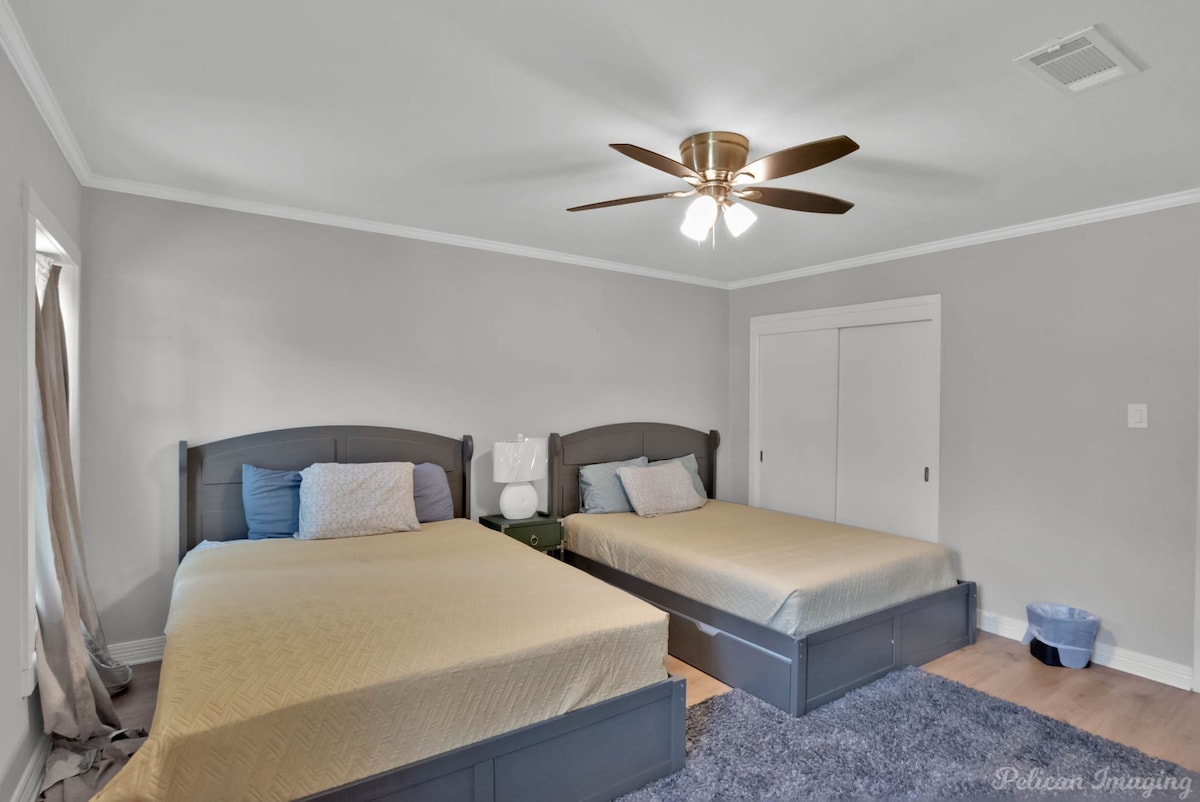 Welcome to Peachy Keen, located in the heart of Shreveport! This spacious 3-BR, 2- full bathroom house sleeps up to 8 guests and is perfect for long-term travelers. It's just 8 minutes from all major casinos, Barksdale Air Force Base, and Brookshire Grocery Arena. Sleeping arrangements are as follows: two twin trundle beds, two queen beds, one full, and one king bed. All bedrooms have TV's. Fully equipped kitchen, in-unit washer and dryer, garage parking, and a large backyard.